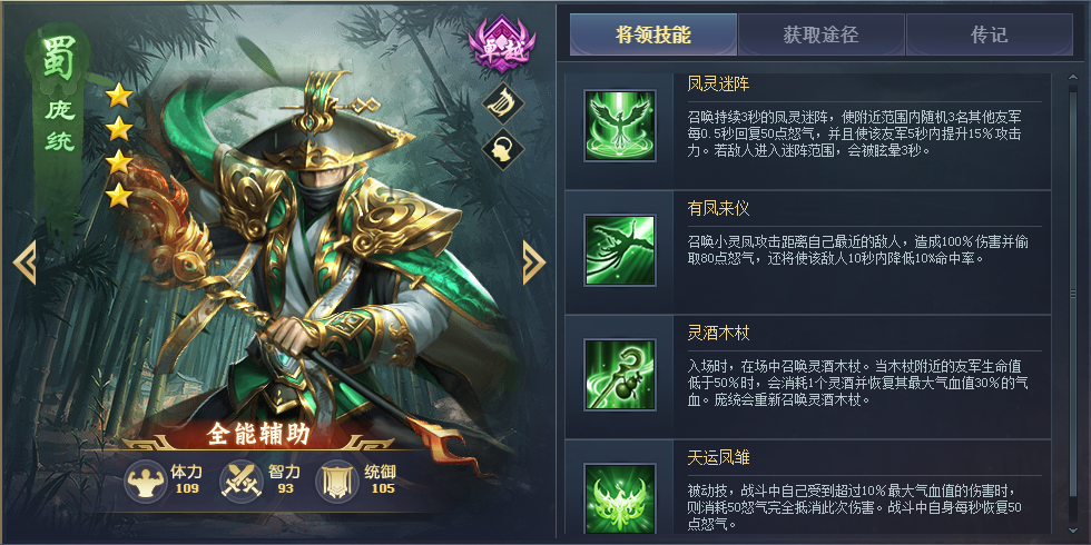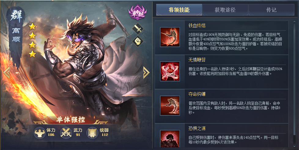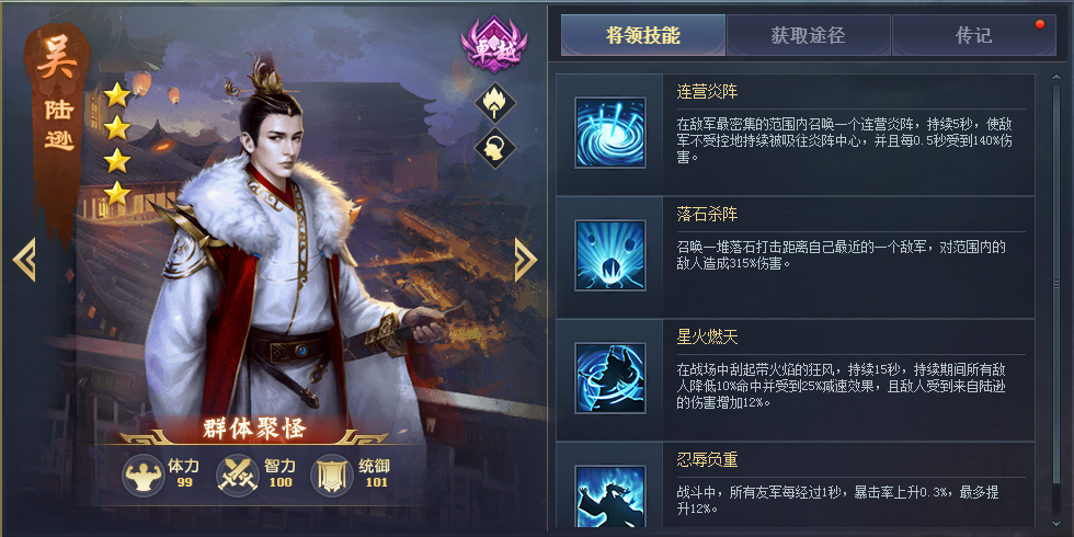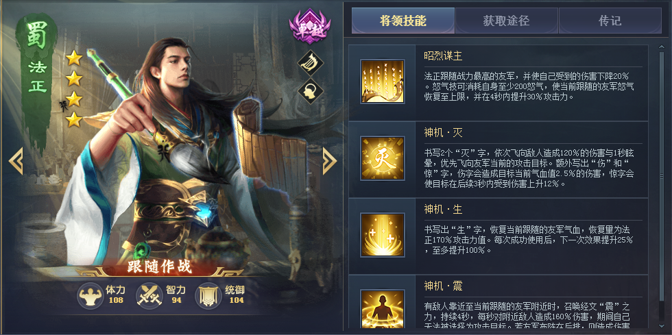 平民神将,可以斩杀血量低的将领,搭配诸葛亮、陆逊之类能压低敌方血量的将领能发挥出最大的作用,三技能能拉取和自身对位的敌方将领过来,配合自身减少敌方怒气的技能,开战时能拉到敌方的核心输出,战斗就已经赢了一半。