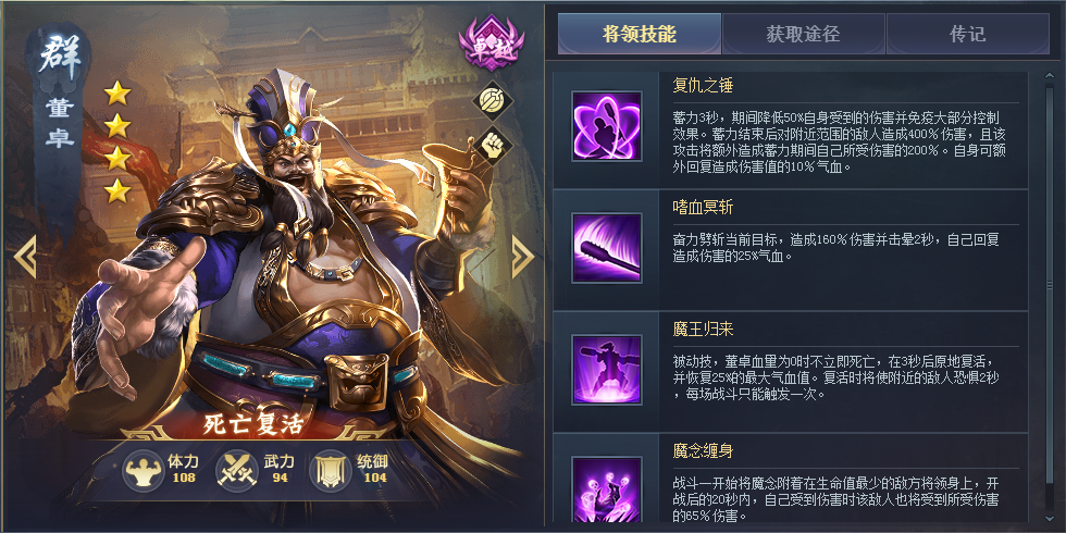 前排坦克,怒气技能减免自身所受的伤害,能让他在战斗期间抗大量伤害,三技能还会在第一次死亡时复活。