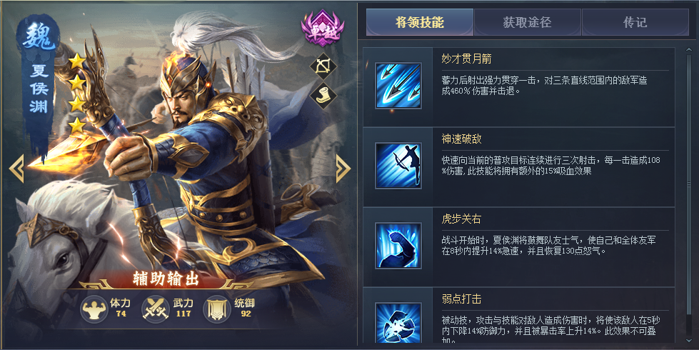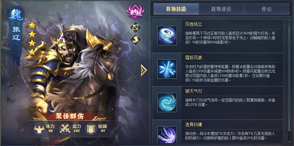 半辅助半输出将领,输出较高高,三技能开局加急速恢复怒气,能让己方武将更快的释放技能,能搭配四技能降低防御,让己方打人伤害更高。